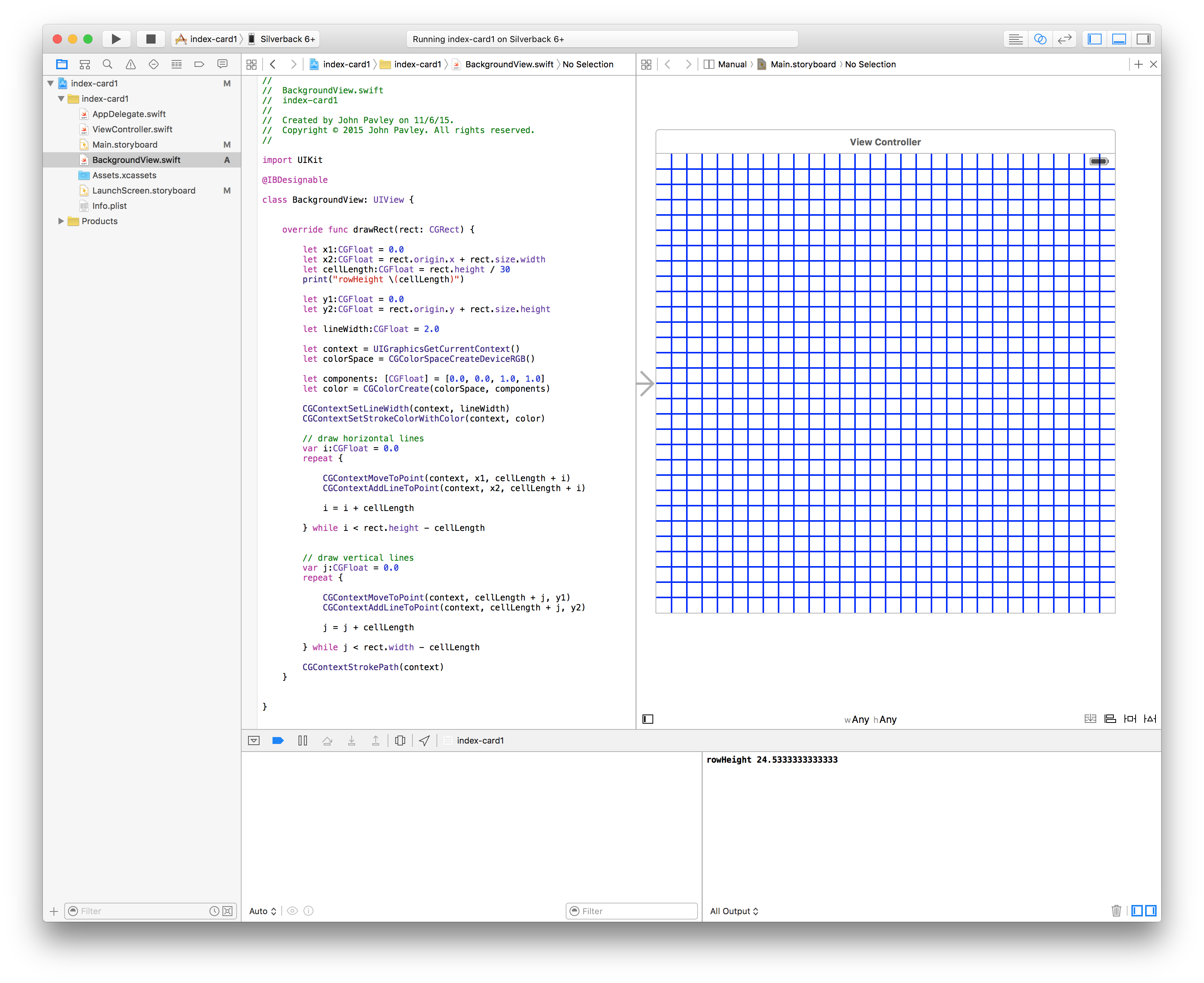I’m just fooling around at this point so I don’t know if two repeat loops is the most efficient way to draw a grid. Right now I’m just happy to see a grid show up. I’ll optimize it later–if needed! To draw my lines I start at 0 and draw each line a cellLengh apart. CoreGraphics is a bit like Logo’s turtle graphics: I have to add drawing commands to the context, building up the image step by step behind the scenes.